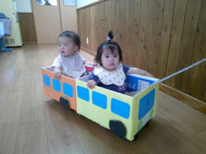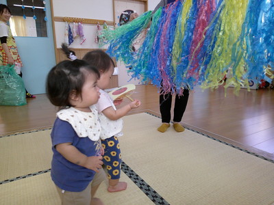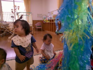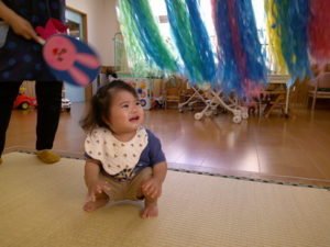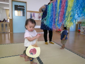 スズランテープのカシャカシャの音を聴いたり、扇風機の風でゆらゆらするカーテンをくぐったり、うちわで♪うえからしたから おおかぜこ~い♪と仰いで、風が来るのを楽しみました。