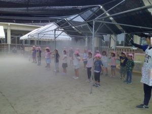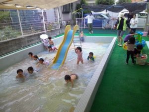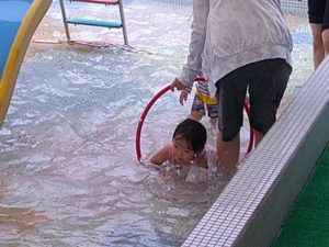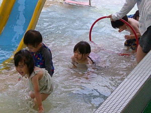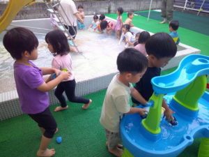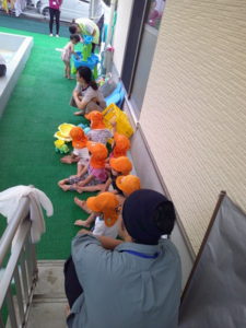 お集まりの後は、トイレを済ませて自分で水着に着替えてプール遊びを楽しみました。