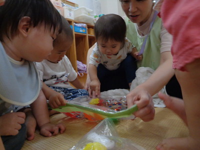 中に入っている魚の玩具にも、興味津々の子ども達でした。