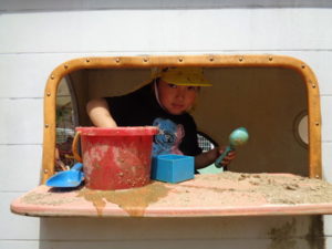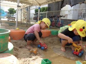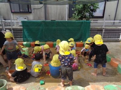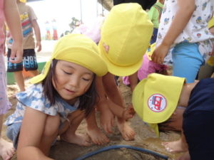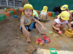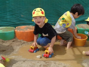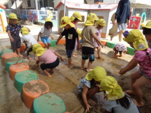 砂場に水を入れて、始めは足で砂の上を歩いていましたが、だんだんと水の中に足を入れて、そのうちバシャバシャ始めて・・・。