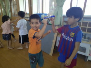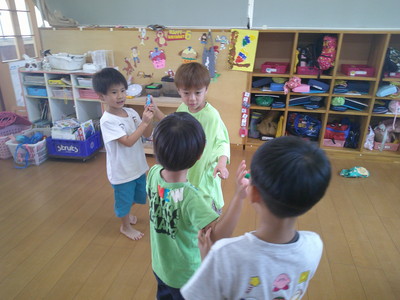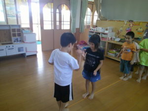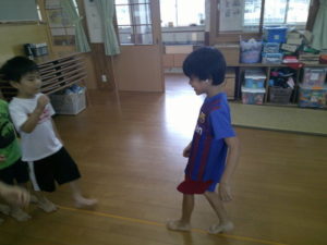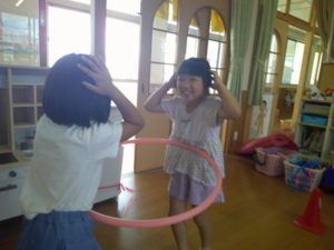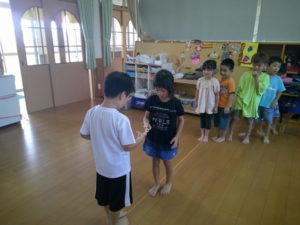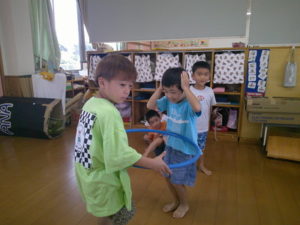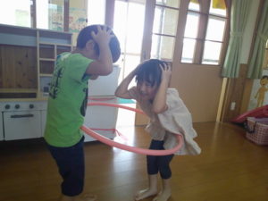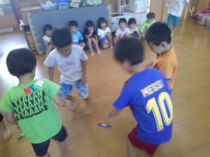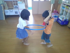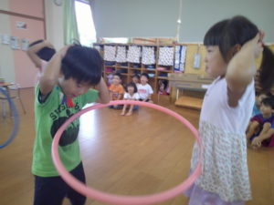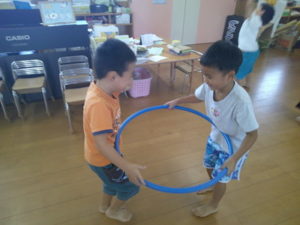 今日は、フープリレー、ペン🖊落とし、じゃんけんゲームの3つのゲーム遊びをしました。