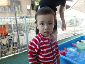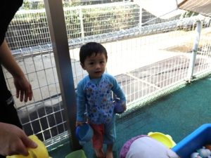 プールの回りで遊んで中々プール内に入ろうとしないので抱っこして、入れるとちょっと