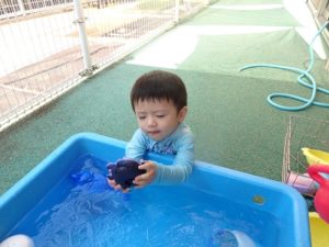プールに入る事が出来る子ども達は、途中で着替えを行い、プール遊びを楽しみました。