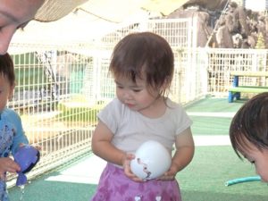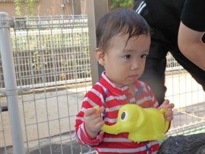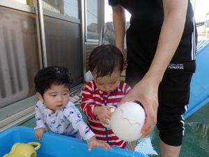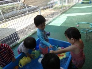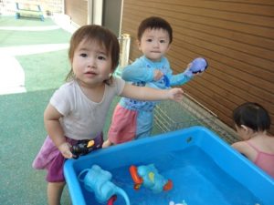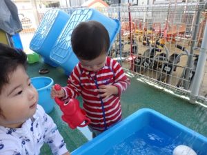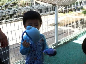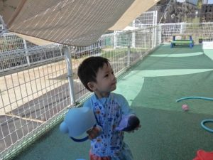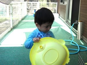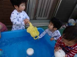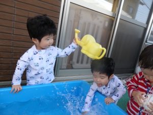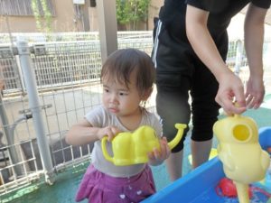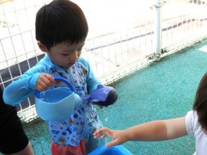 とっても暑い中、ジョーロや、水用の玩具を使って「ジャー」っと水を上から落として