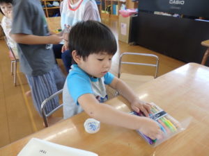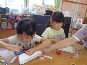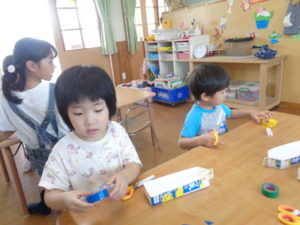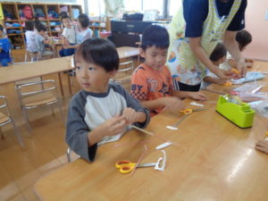 きりん組の保育室は、ハサミを使用して、水遊び用おもちゃのアメンボ・ヨット・ボードを製作しました。はさみ使いも難しそうでしたが
