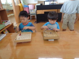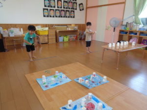 ぱんだ組では、輪投げ、的当て、ビー玉転がしのゲームが用意されていて、真剣な様子でゲームに取り組む姿が見られ賑やかな
