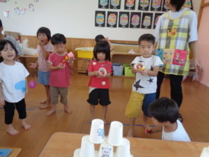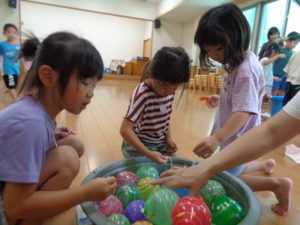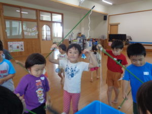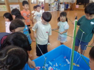 ランチルームでは、ビニールプールに水をはり魚釣り、ヨーヨー釣りをしました。色んな色のヨーヨーを釣っていて、