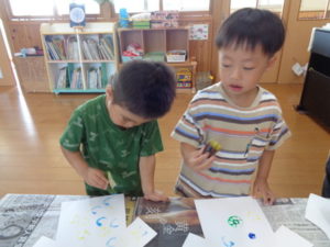 Tシャツ型の画用紙に、思い思いにスタンプをして楽しみましたよ。
