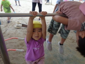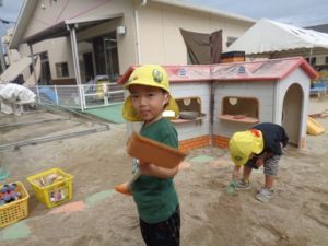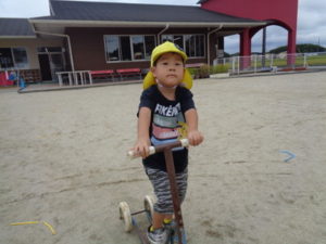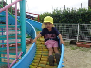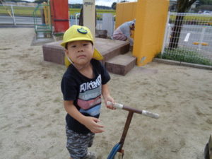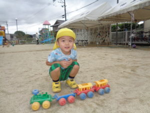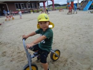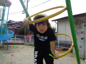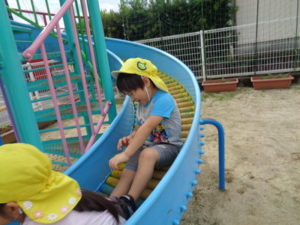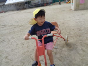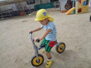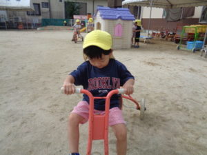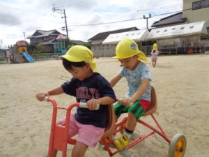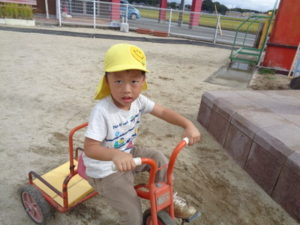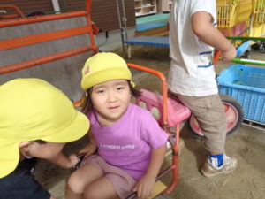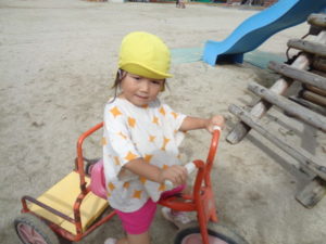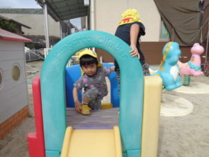 滑り台やリングジャングルジムの遊具で遊んだり、乗用遊具にまたがり園庭を移動したり、ままごと遊びを友達と楽しみました。