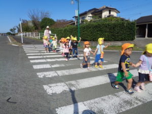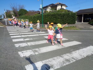 横断歩道や道路を渡る時は、しっかりと手を上げて渡る練習も頑張りました。