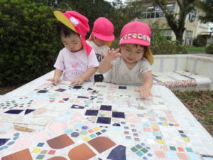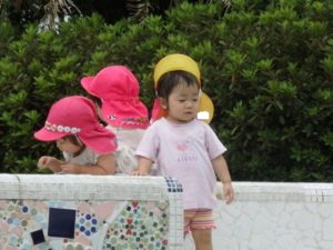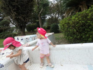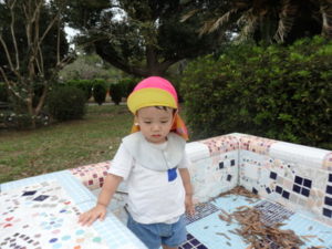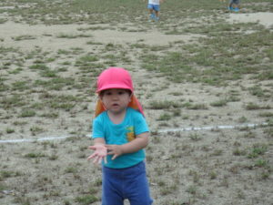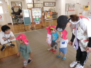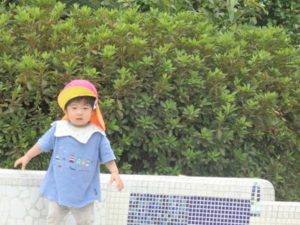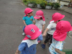 うさぎ組のテラスで、お友だちと手を繋ぐのですが、すぐに放してしまって、みんな自由にうろうろが始まり、