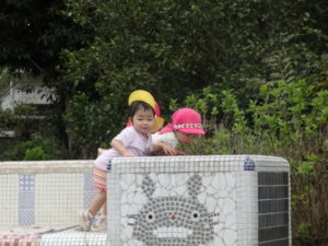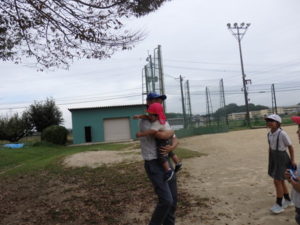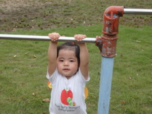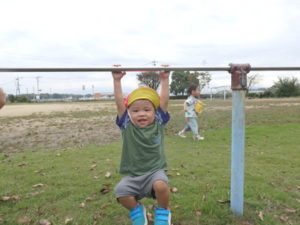 校庭では、鉄棒にぶら下がったり、トトロの椅子によじ登ったりしてよく動いていました。