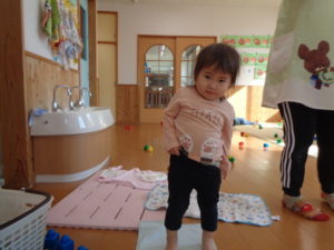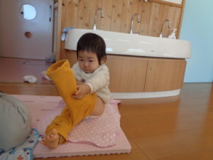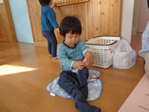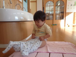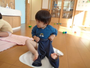 朝の排泄時、段々と自分でオムツやズボンを履きたいという意欲が出てきて、毎日頑張っています。