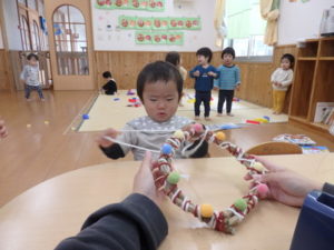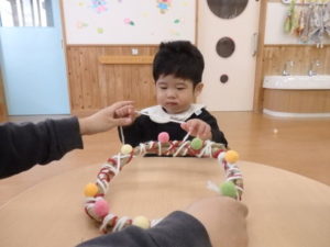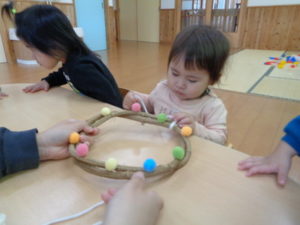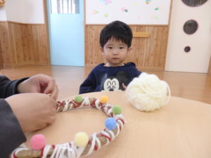 昨日お散歩で拾ったドングリを付けたり、毛糸を巻いてデコレーションしました。