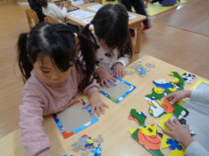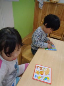 パズルにハマっていた子ども達は、集中して難しそうな小さいパーツも逆さまにしたり、「こうかな~??」と悩みながら作り、出来たら次のパズルをしていました。