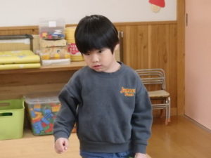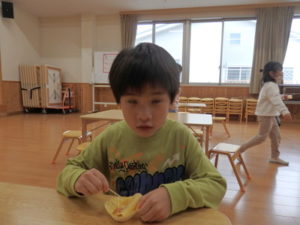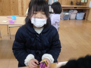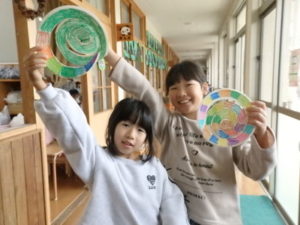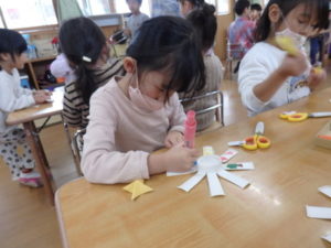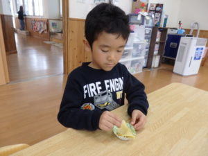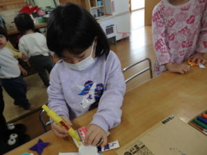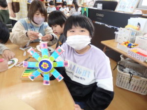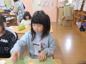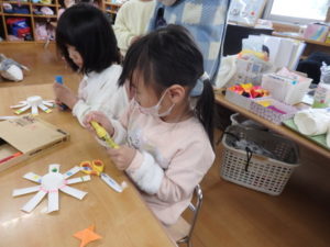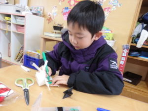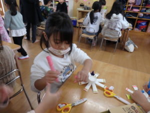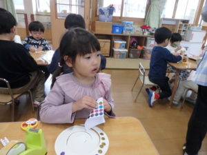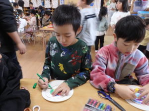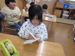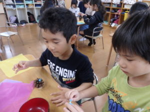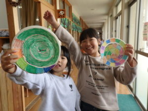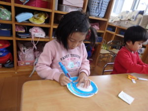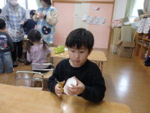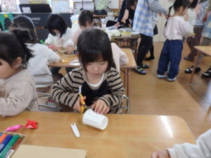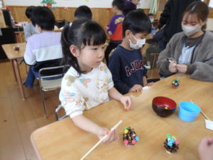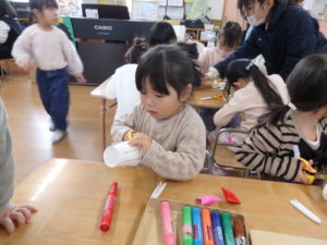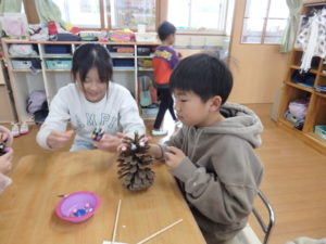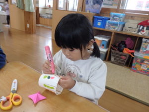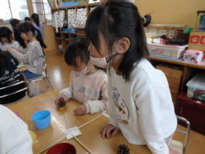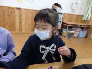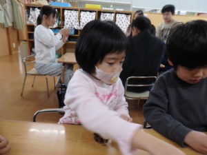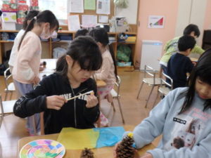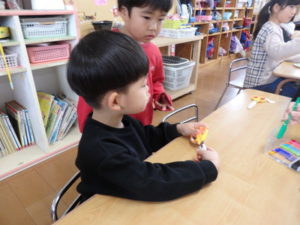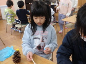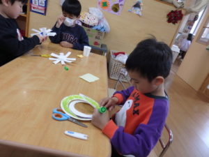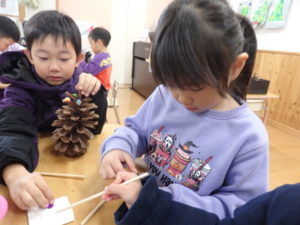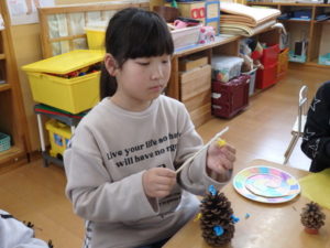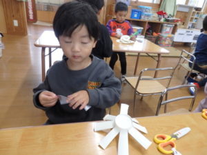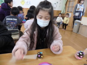 ランチルームはクレープ作りコーナー、ぱんだ組ではピンポン玉を使ってペットボトルに入れるゲームコーナー、きりん組は来年の干支「ヘビ」を紙皿で、独楽を紙コップで作るコーナー、くま組はまつぼっくりを使ってのクリスマスツリー作りのコーナーに分かれていて、それぞれ好きなコーナーに行って活動を開始しました。ピンポン玉ゲームでは、ピンポン玉を一回床にバウンドさせて机に置いてあるペットボトルの中に入れるというもので、中々入らず苦戦していましたが、1つでも入ると「入った~」と喜んでいました。クリスマスツリー作りでは、大きなまつぼっくりに色んなお飾りを付けてかわいいツリーが出来ていました。干支の「ヘビ」作りでは、らせん状に紙皿を切り、模様をつけて「ヘビ」が出来ていました。