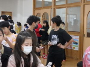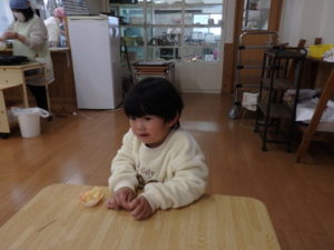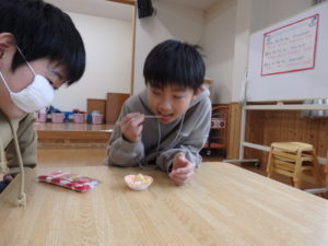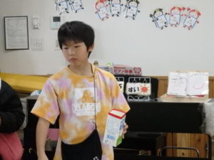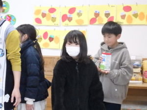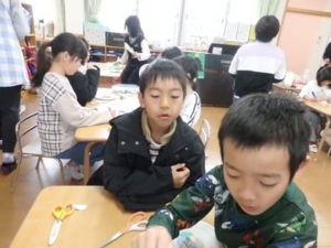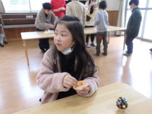 ランチルームでは、クレープ作りがあり、焼いたクレープにチョコスプレー、粉砂糖、黒蜜をかけてクレープが出来上がり、おいしそうに食べていました。11:00までで「たしまっこタイム」が終わり、その後は、小学生のお楽しみ、「ビンゴゲーム」を行いました。早くにリーチになり、立っていた子は、中々「ビンゴ」とならず結局終わりの方まで残ってしまいました。それでも、景品をもらってとっても喜んでいました。