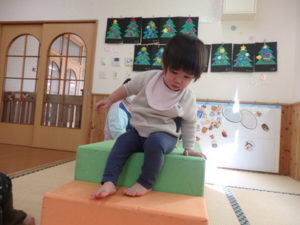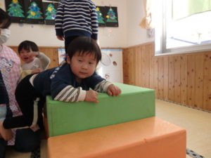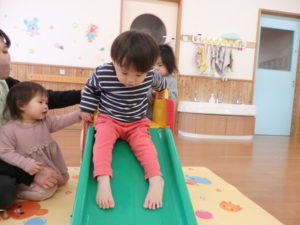 今日は、風船遊びと、技巧台、滑り台を使って体を動かして遊びました。