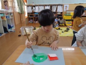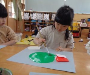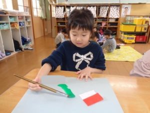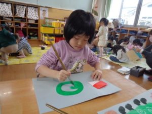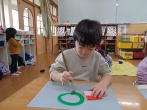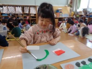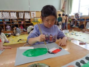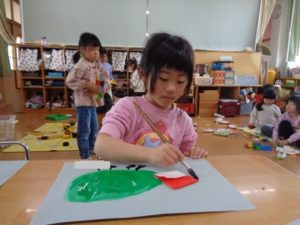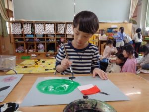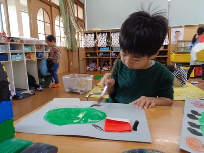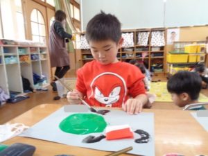 獅子舞いの顔を折り紙で作った後、耳や足、体を絵の具で描きました。