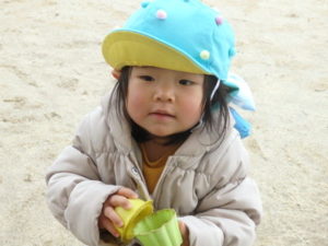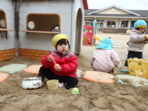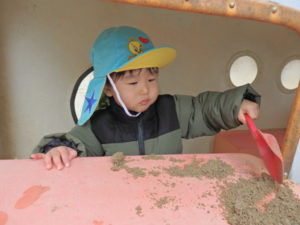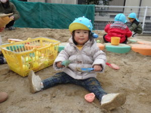 久しぶりの外遊びでテンションがあがり、広い園庭をトコトコ歩いて👟移動してみたり、砂場でもくもくと砂遊びをしていました。