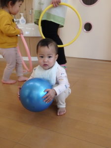 今日は、お部屋でフラフープやボールを使って遊びました。