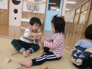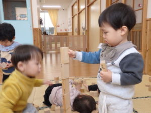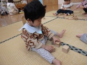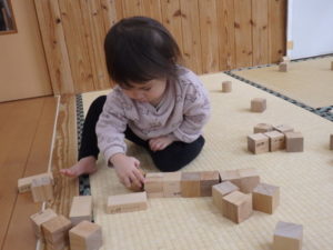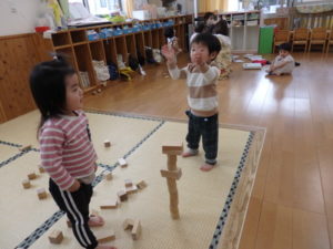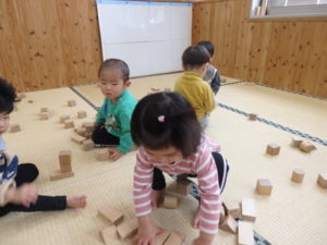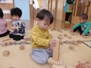 積み木遊ぶでは、お友達と一緒に高く積み上げたり、小さい積み木と大きい積み木を組み合わせたりして楽しんでいました。