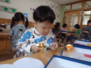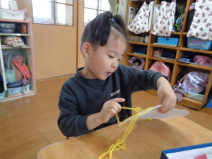 ひも通しでは、「隣の穴に通す」と言いながら、考えてひもを通す事が出来ていました。