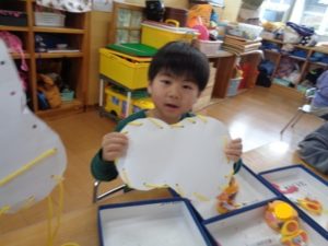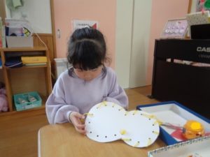 雪だるま⛄・帽子・マフラーをハサミで切った後、ひも通しを行いました。