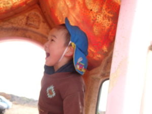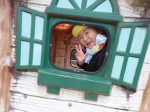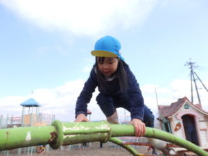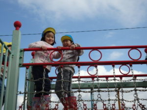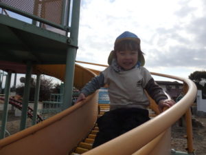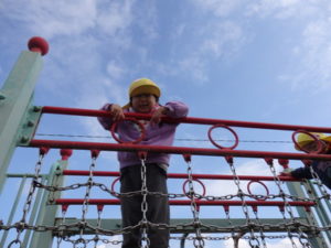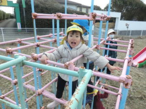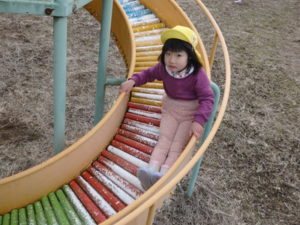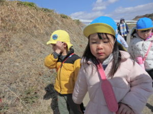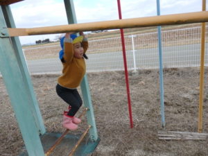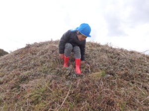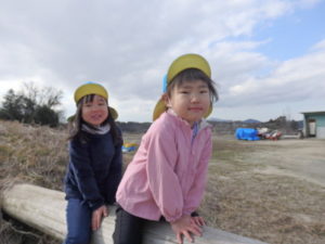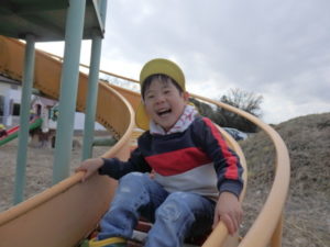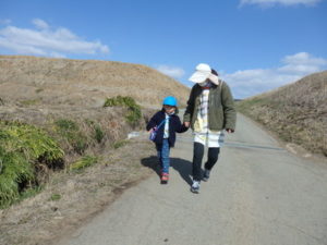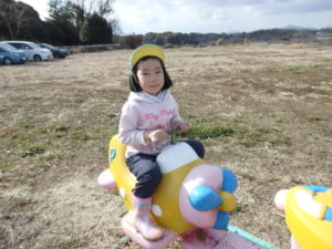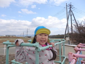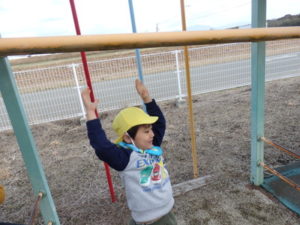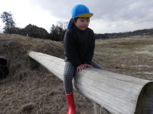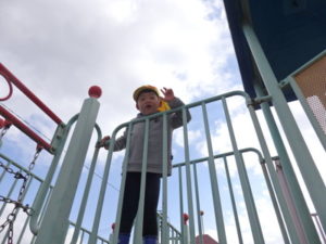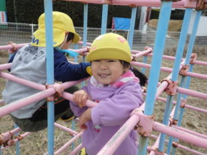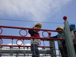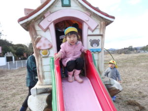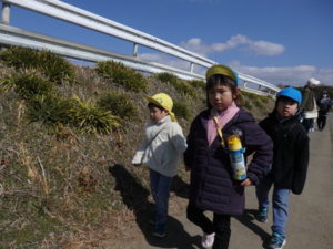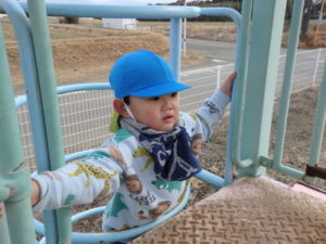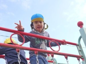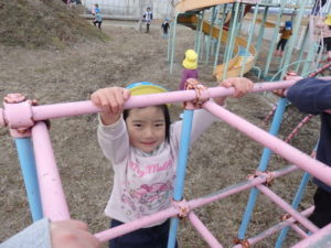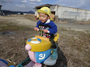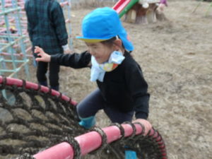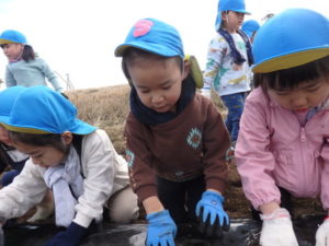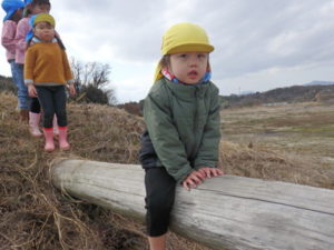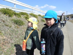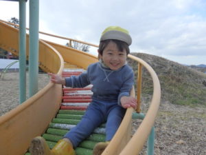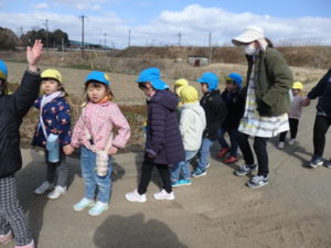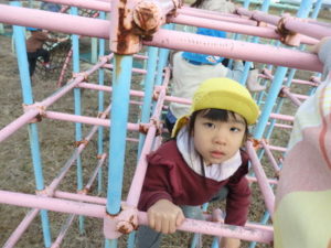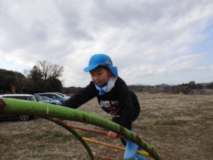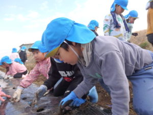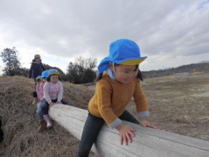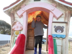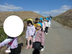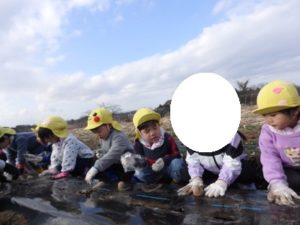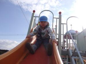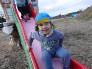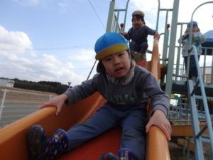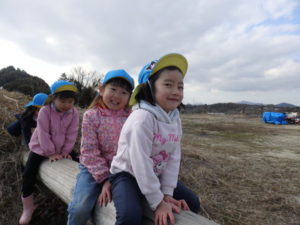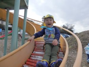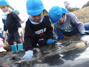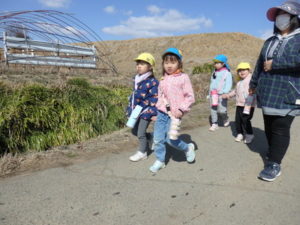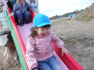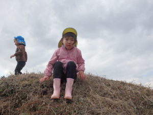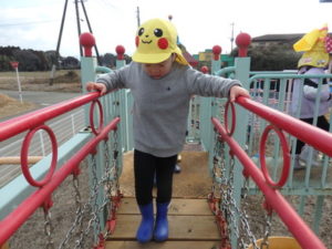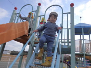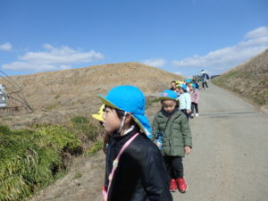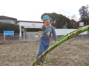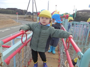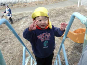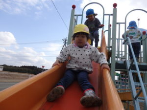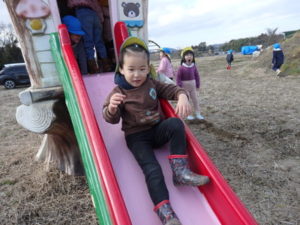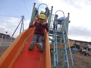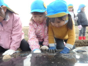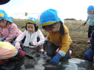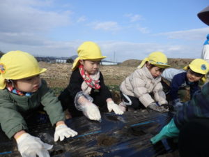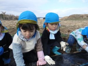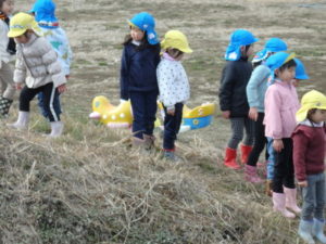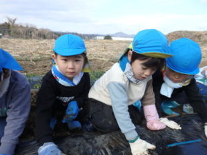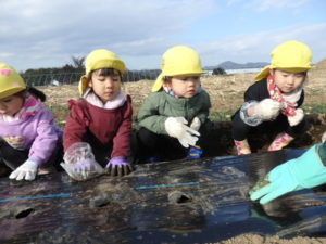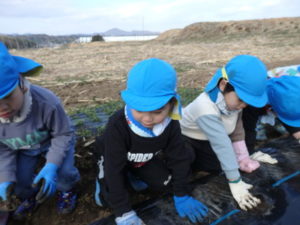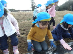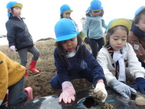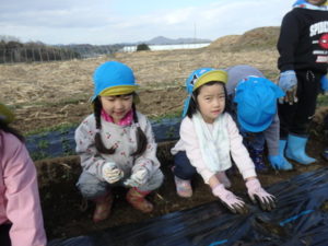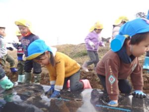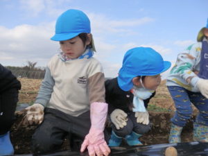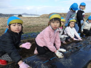この日がぱんだ組さん初めての、畑登園とあって、七城の畑に登園すると、新しく買ってもらった長靴を自慢げに見せてくれました。 9:00過ぎになってもお天気はくもりのまんまで日が差していない分ちょっと寒く、作業の前に子ども達に洋服を重ね着させました。こうして準備万端で畑に行き、じゃが芋の植え方を習いました。あらかじめじゃが芋の切り口に灰を付ける作業をしていたので、灰の付いた方を下に向けて穴に入れ、周りの土を優しく掛けるように言うと、しっかり聞いていて穴に入れた後土を被せちゃんと植える子ども、穴の中にコロッと入れたまま土も被せずに植えていると思う子ども等、様々でしたがじゃが芋植えの体験が出来ました。その後は、お待ちかねのたしまっこランドで遊びました。ここでもぱんださんは初めてのたしまっ子ランドに目をキラキラさせながら、築山に登ったり、ジャングルジムで遊んだりと、よく動いていました。しばらく遊んだ後、畑から保育園まで歩いて帰りました。初めは、「車で帰りたい~」と言っていた子ども達も、くま組、ぱんだ組手を繋ぎ、3.5㎞の距離を約1時間20分かけてしっかり歩いて帰りました。帰って来た時は意外にもぱんだ組よりくま組の方が疲れているように感じました。