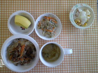 ヨーグルトにバナナ、みかん、りんごを入れましたよ!