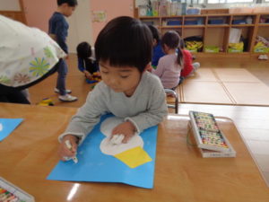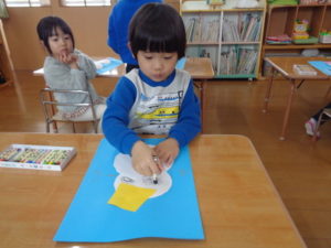 今日は、先日ハサミで切って作った雪だるまに顔や手、お洋服を描いて仕上げました。