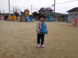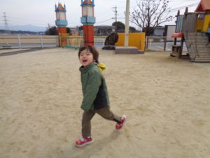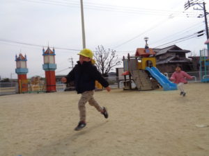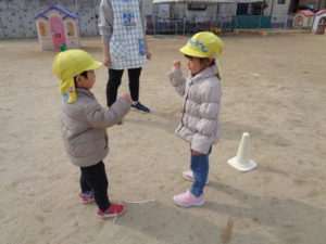 ゛タッチされたら鬼になって追いかける”゛タッチしたら鬼から逃げる”を知らせながら遊びましたが、とにかく走り回って楽しんでいる様子でした。陣取りゲームでは、じゃんけんがまだうまくいかない様子はありつつも、前の人が負けて戻ってきたらスタートする事を意識して遊びました。