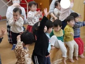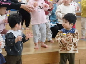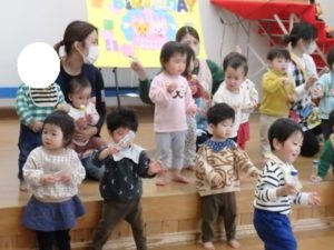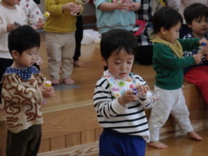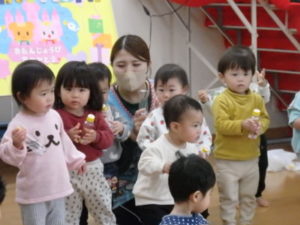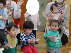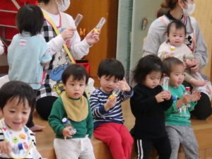 誕生児紹介の後、ひよこ組🐣・りす組🐿さんが、「コンコンクシャン」の歌と手作りマラカスで「おもちゃのチャチャチャ」の楽器遊びを披露してくれました。