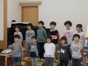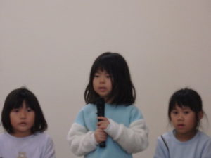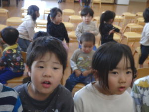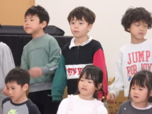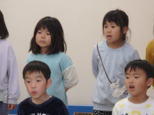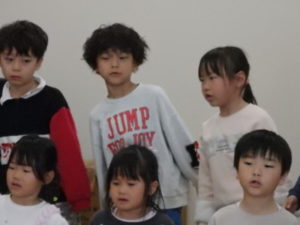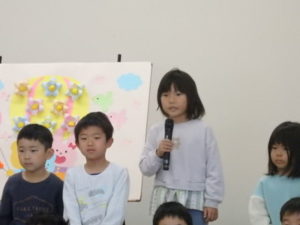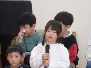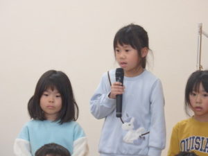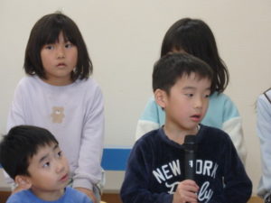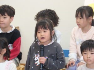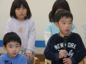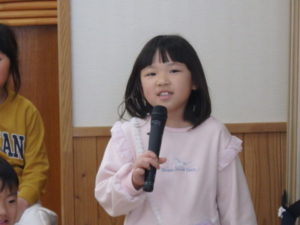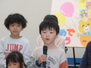 年長児一人ひとり、自分の行く小学校や小学生になってから頑張りたい事を上手に発表し、歌「ゆうきのうた」を歌ってくれました♪