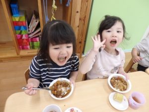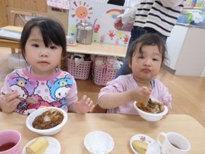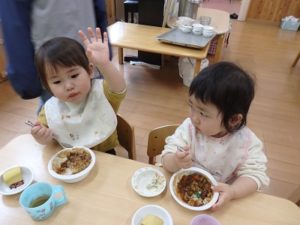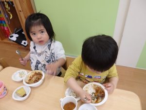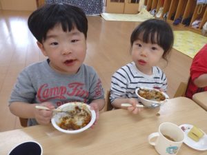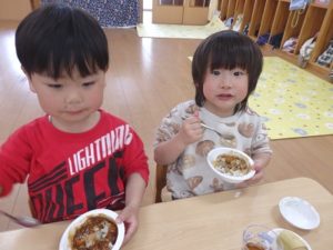 給食はビーフシチューで、「おいしい」と、ニコニコでおかわりしました。