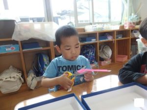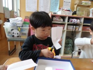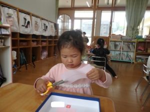 ハサミをまだ開く事が難しいお友達が多かったのですが、ケガすることなく終える事が出来ました。