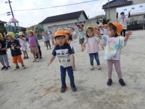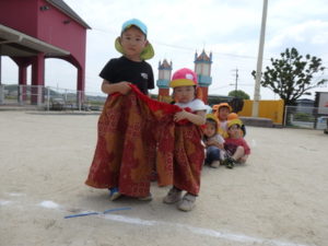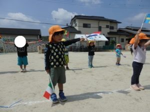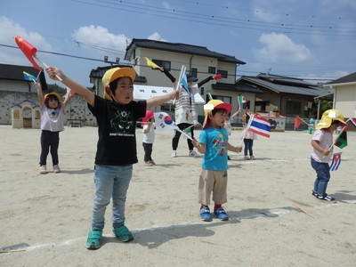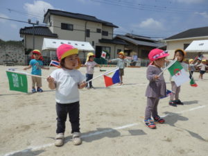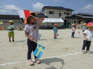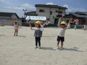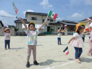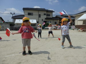 お遊戯では、「世界中のパレード」という曲に合わせて、旗を持ち踊ります。