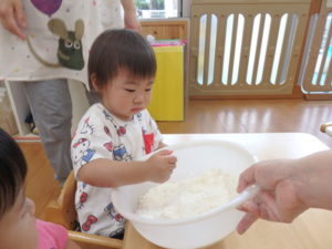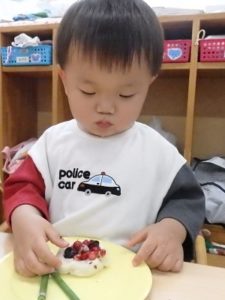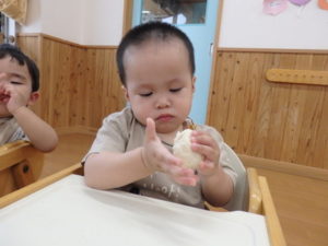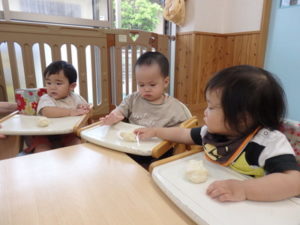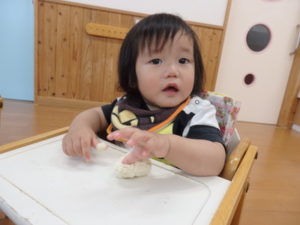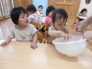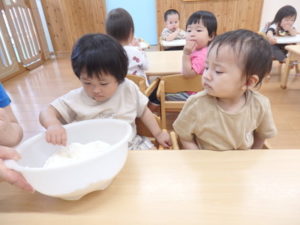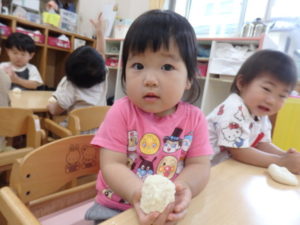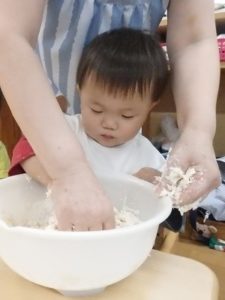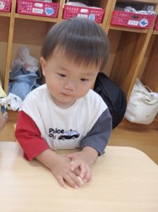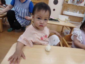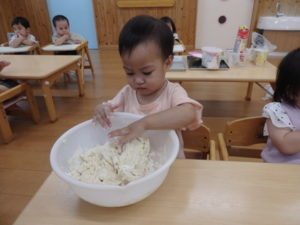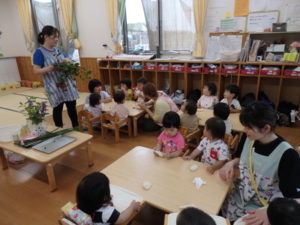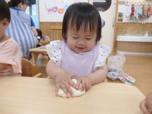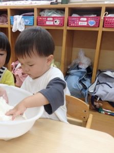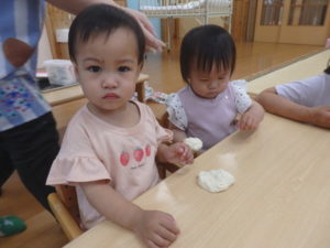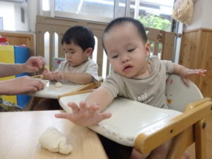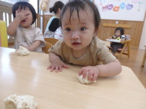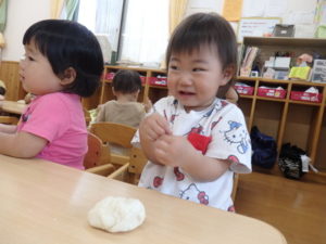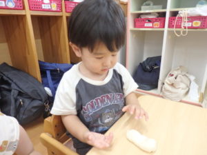 今日は、お集まりを済ませてから、小麦粉粘土を使って遊びました。