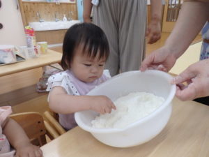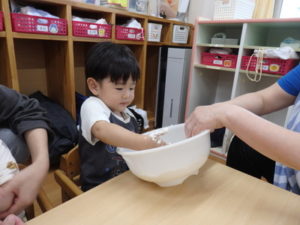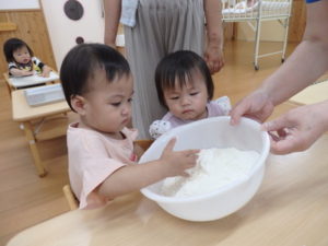 ①サラサラ~ ・・・何だろう?触ってみます。 怖いのか、嫌がって手を引っ込める子もいました。