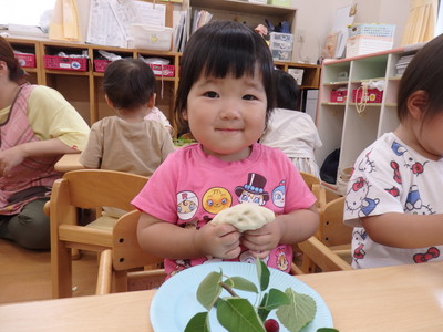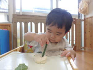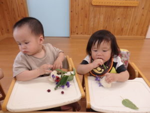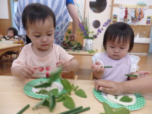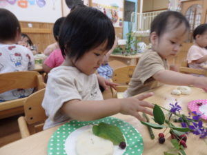 小麦粉粘土で遊んだ後は植物遊びです。トクサ(さわってザラザラ)、レモンバーム(こすって匂う)、デルフィニューム(きれい)、ジューンベリー(つまむ、おいしそう)を使って、いろんな感覚に触れました。