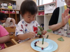⑥ちょんちょんちょん・・・いろんな植物を思い思いに付けケーキやピザ、カップケーキ、アイスクリームが出来ました。