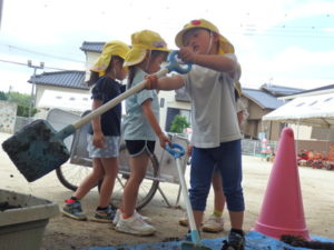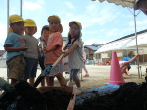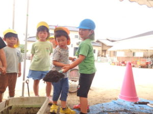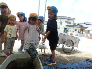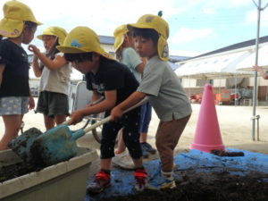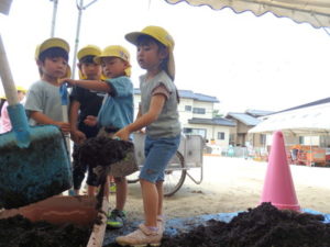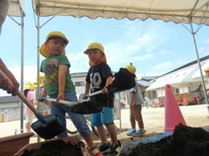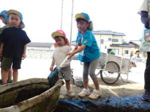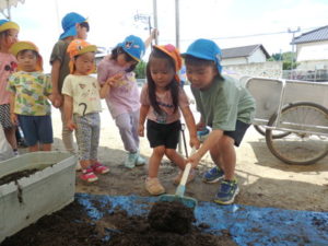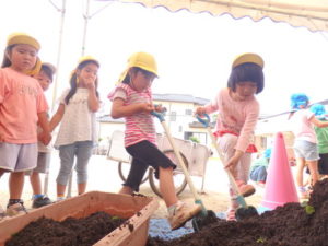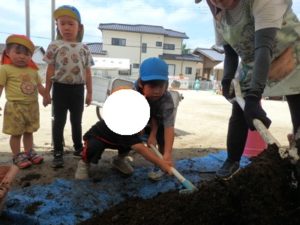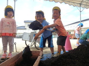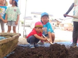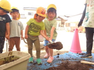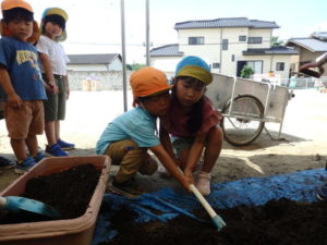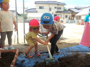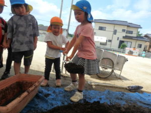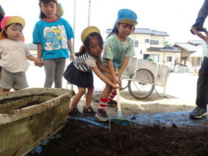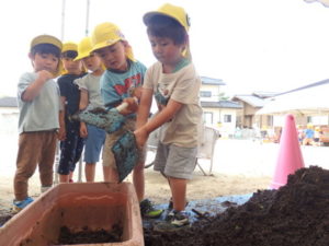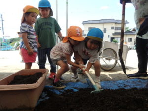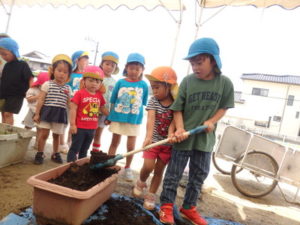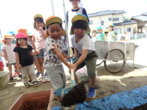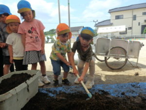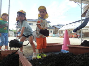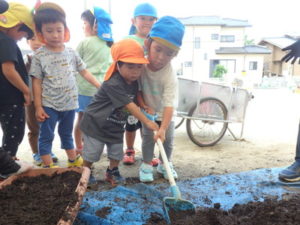 しっかり混ぜた後は、きりん組🦒・ぱんだ組🐼はペアになり、くま組🐻は自分の力でプランターの中に、優しく土を入れました。