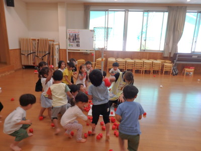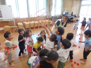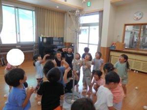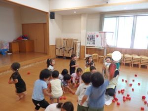 今日は、絵本の読み聞かせを行い、その後玉入れ遊びをしています。