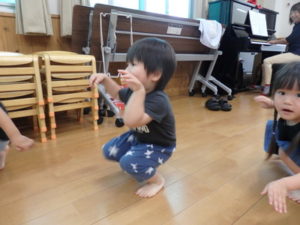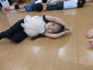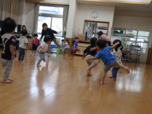 今日は雨☔が降っていたので、うさぎ組🐇・ぱんだ組🐼はランチルームでリトミックをしました。