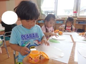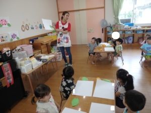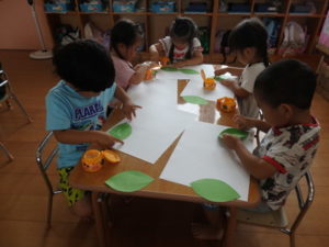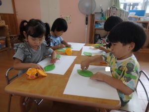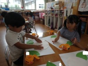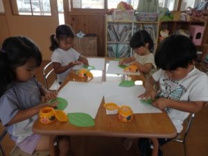 葉っぱ🍃に模様を描き、お花の土台をのりで貼りました。