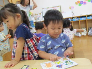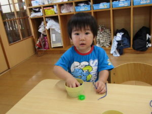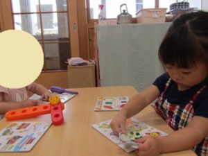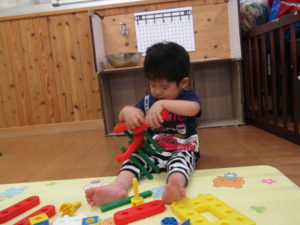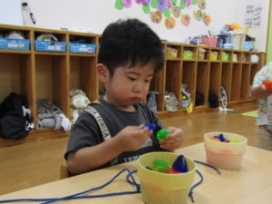 工具ブロックやひも通しパズルなどの室内コーナー遊びを通して、それぞれが興味のある遊びに夢中になって取り組んでいました。