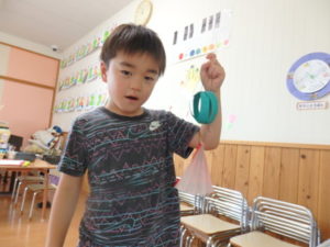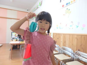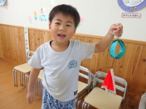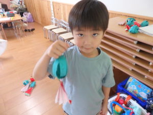 スイカのボールを作った後、折り紙でスイカを折り、つなげて風鈴🎐ぽく仕上げました。