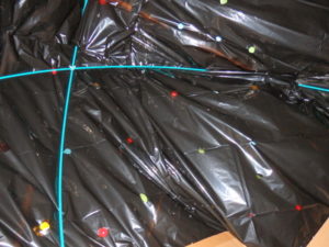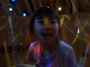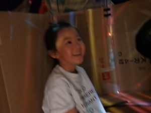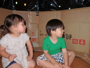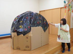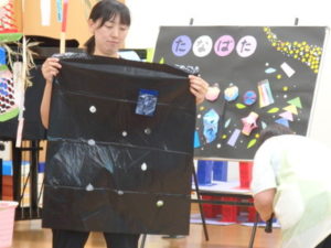 ゴミ袋・カラーセロハンを使って、用意していた段ボールにかぶせて、手作りのプラネタリウム⭐が完成しました。