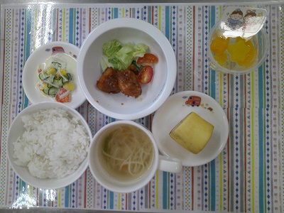 給食は、鶏肉の甘酢からめとそうめん汁でした。