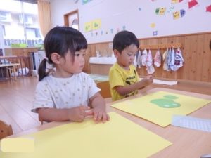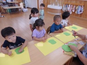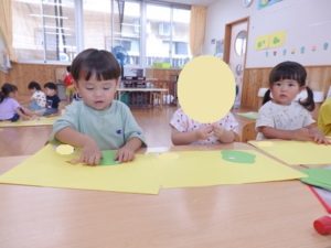 シールやクレヨン🖍を使って、目や手足を貼ったり、描くことをしました。